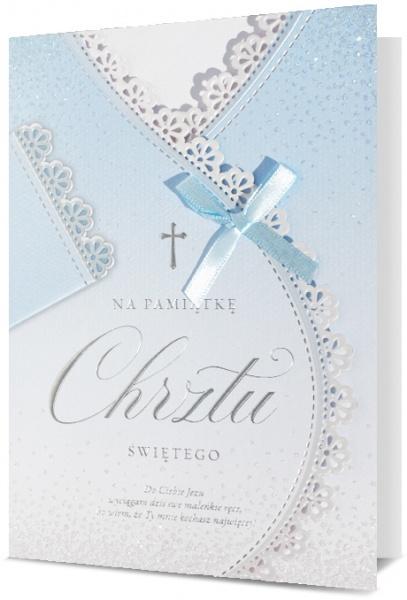 Elegancki karnet B6 z okazji chrzcin. Bogate zdobienia, połyskujące cyrkonie, perłowa folia oraz brokat. Wewnątrz karnetu życzenia oraz elegancka koperta. Format: 19.5x13 cm.