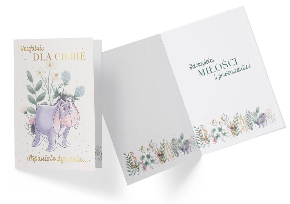 Karnet DS - karnety z licencją Disney, kolorowe i zdobione metalizowanymi detalami z zewnątrz, całkowicie pokrywane folią UV. Każda kartka posiada kolorowe życzenia w środku.