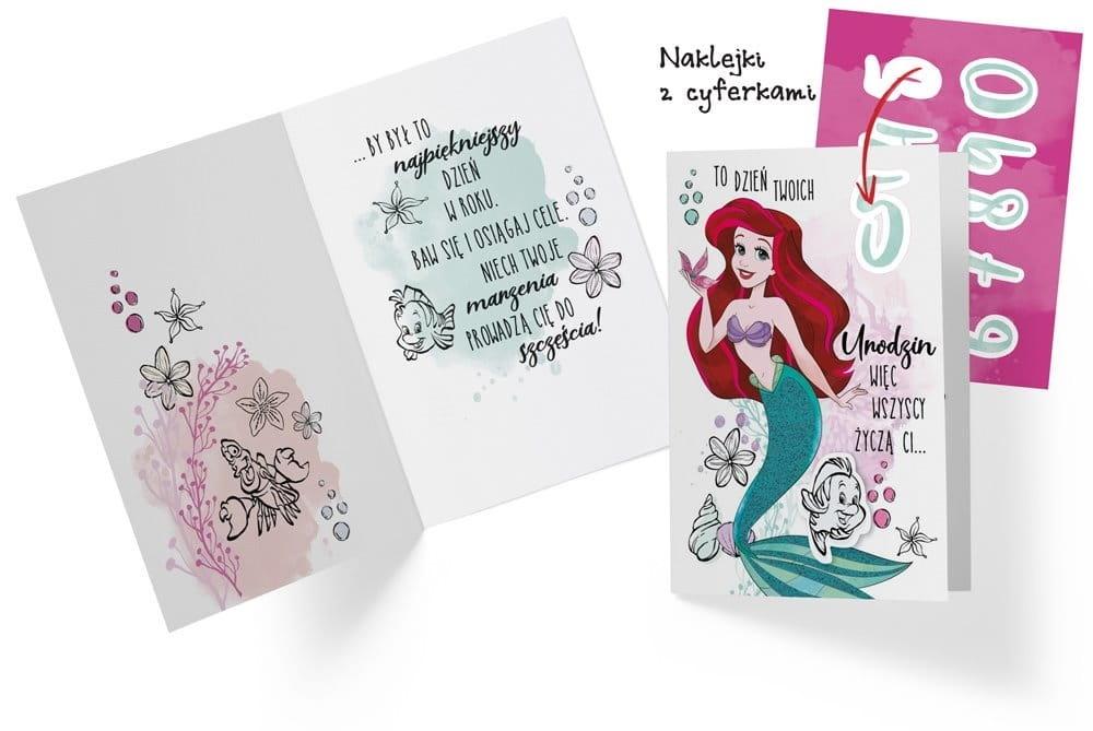 Kartka urodzinowa z serii dsk Disney jest kolorowa z każdej strony i zdobiona na froncie. Wyróżnia ją to, że do zestawu dołączone są naklejki z cyferkami, dzięki którym kartkę można spersonalizować i dopasować do każdych urodzin. W środku kartki znajduje się kolorowa ilustracja z krótkimi życzeniami, a do zestawu dołączona jest kolorowa koperta. Specyfikacja: Wielkość kartki: B6, 12.5 x 17.6 cm Zdobienie: Tak Tekst życzeń w środku: Tak Okazja: urodziny Do zestawu dołączone naklejki.