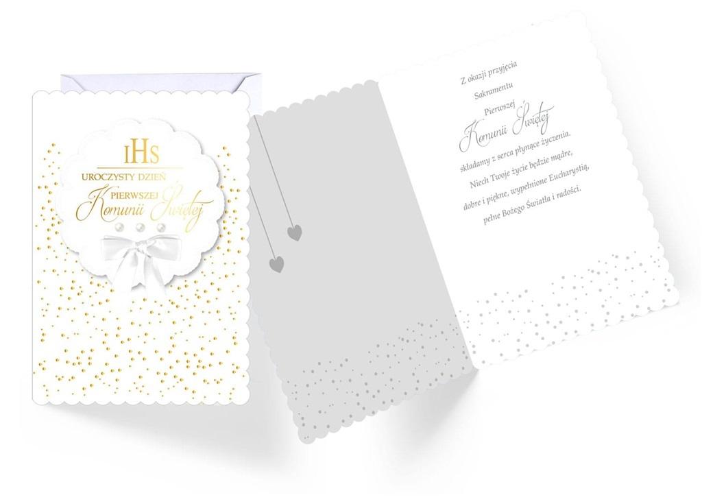 Kartka B6 z ozdobnej serii Dream Cards na Komunię - nieduża, ale robi wrażenie dzięki atrakcyjnej kolorystyce i ciekawym zdobieniom. To idealny wybór łączący przyjazną cenę z jakością. Cechy szczególne: wielkość: B6, 16.6 x 11.7 cm po złożeniu, koperta: w zestawie, kolorowa, zdobienia: różnorodne, bogate (w zależności od wzoru: przyklejane dekoracje, elementy biżuteryjne, odstawniki, brokat metaliczne folie, tłoczenia itp.), okazja: Komunia