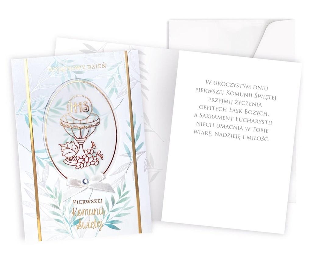 Kartka B6 z ozdobnej serii Dream Cards na Komunię - nieduża, ale robi wrażenie dzięki atrakcyjnej kolorystyce i ciekawym zdobieniom. To idealny wybór łączący przyjazną cenę z jakością. Cechy szczególne: wielkość: B6, 16.6 x 11.7 cm po złożeniu, koperta: w zestawie, kolorowa, zdobienia: różnorodne, bogate (w zależności od wzoru: przyklejane dekoracje, elementy biżuteryjne, odstawniki, brokat metaliczne folie, tłoczenia itp.), okazja: Komunia