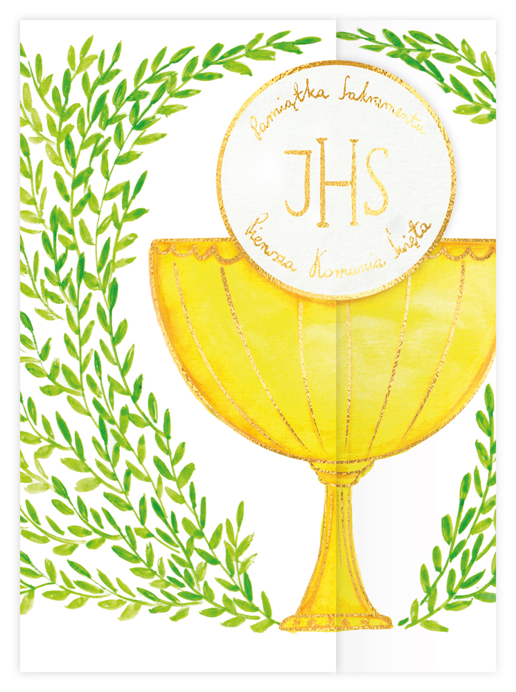 Karnet w formacie B6 z wyciętym półkolem. Złocony, teksy życzeń w środku. Wydrukowany na wysokiej jakości papierze. Koperta w zestawie.