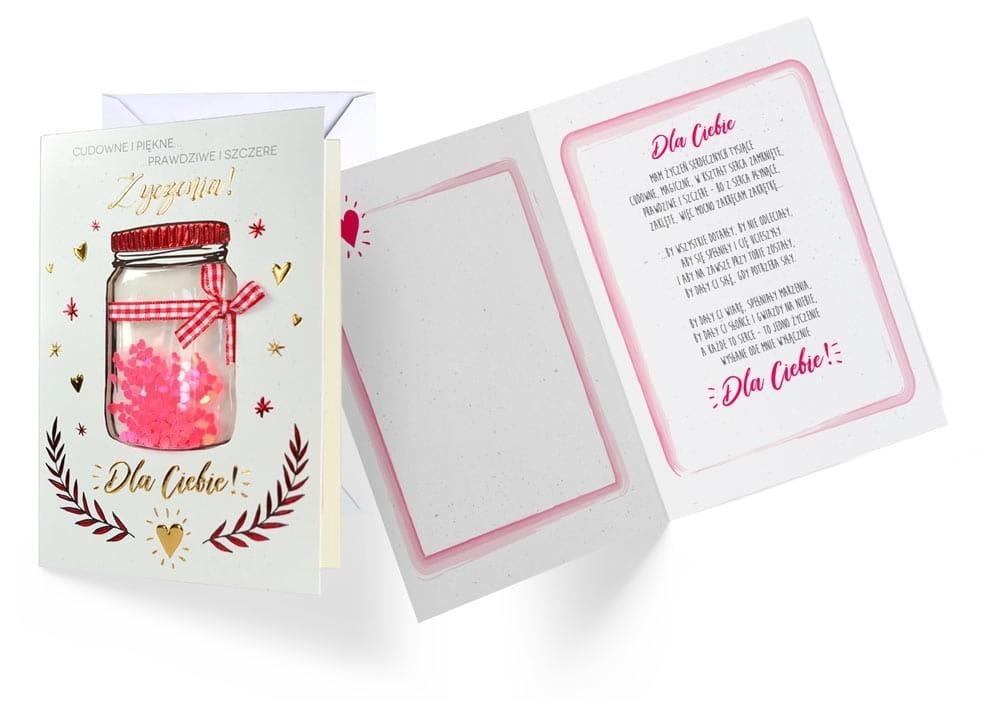 Co jest lepsze od pięknej kartki? Piękna kartka z gadżetem! Brokat, złote gwiazdki, cekiny, kolorowe kuleczki - każda kartka z nowej serii Konfetti Kukartka posiada element wypełniony odlotowym konfetti. Oprócz tego, kartki z tej serii są zabawne, kolorowe na zewnątrz i w środku, mają też dodatkowe dekoracje, w zależności od wzoru: tłoczenia, kolorowe folie metaliczne, elementy biżuteryjne, wstążeczki itp. Cechy szczególne: wielkość orientacyjna: B6, 16.6 x 11.7 cm po złożeniu, koperta: w zestawie, kolorowa, zdobienia: dekoracja wypelniona konfetti, dodatkowe (w zależności od wzoru: przyklejane dekoracje, elementy biżuteryjne, odstawniki, brokat metaliczne folie, tłoczenia itp.).