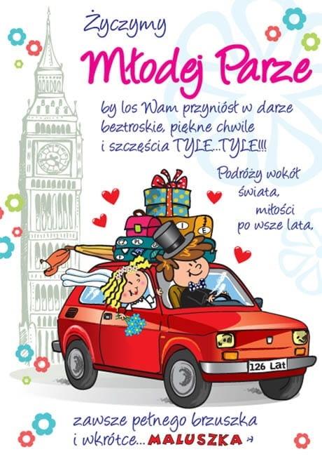 Kartka wielkości B6, zdobiona w zależności od wzoru metaliczną folią lub brokatem, kartka z tekstem w środku, kolorowa w środku i na zewnątrz.