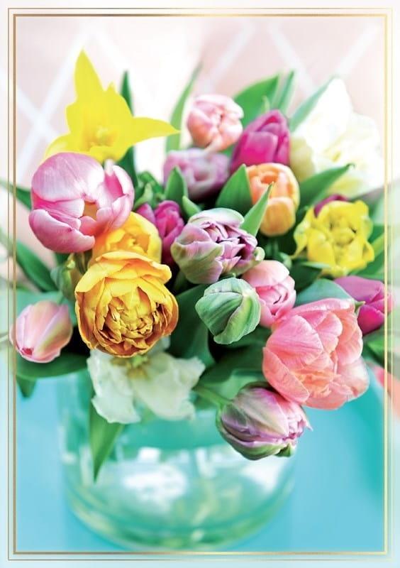 Kartka wielkości B6. Katka ze zdjęciem kwiatów, otoczona delikatną ramką, stonowany kolor, delikatnie zdobiona. Kartka nie posiada tekstu w środku, dzięki czmeu można wypisać własne życzenia. Do kartki dołączona jest koperta.