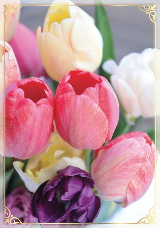 Kartka wielkości B6. Katka ze zdjęciem kwiatów, otoczona delikatną ramką, stonowany kolor, delikatnie zdobiona. Kartka nie posiada tekstu w środku, dzięki czmeu można wypisać własne życzenia. Do kartki dołączona jest koperta.
