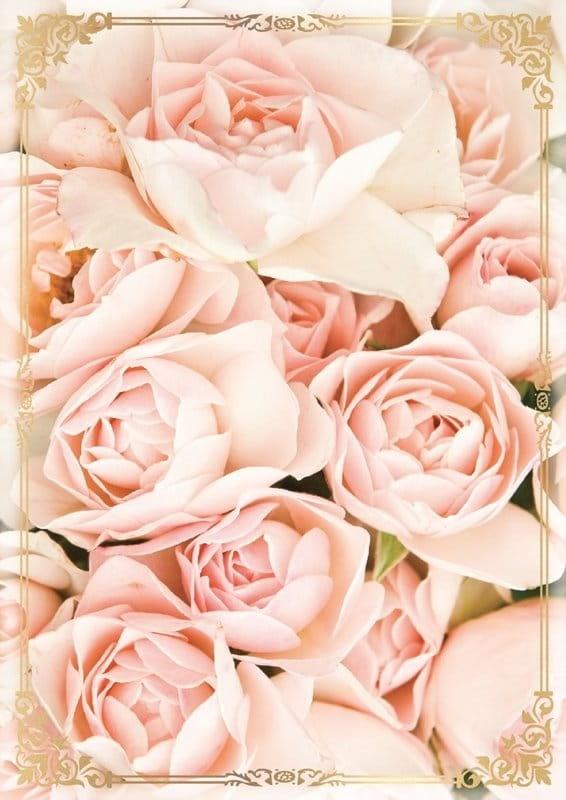 Kartka wielkości B6. Katka ze zdjęciem kwiatów, otoczona delikatną ramką, stonowany kolor, delikatnie zdobiona. Kartka nie posiada tekstu w środku, dzięki czmeu można wypisać własne życzenia. Do kartki dołączona jest koperta.