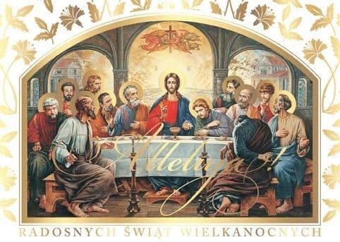Karnet wielkanocny, posiada delikatne złote zdobienia. Kartka posiada tekst w środku, dołączona jest do niej koperta.