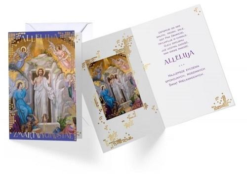 Karnet wielkanocny, posiada delikatne złote zdobienia. Kartka posiada tekst w środku, dołączona jest do niej koperta.