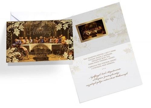 Karnet wielkanocny, posiada delikatne złote zdobienia. Kartka posiada tekst w środku, dołączona jest do niej koperta.