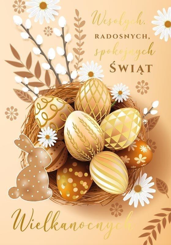 Karnet wielkanocny, posiada delikatne złote zdobienia. Kartka posiada tekst w środku, dołączona jest do niej koperta.