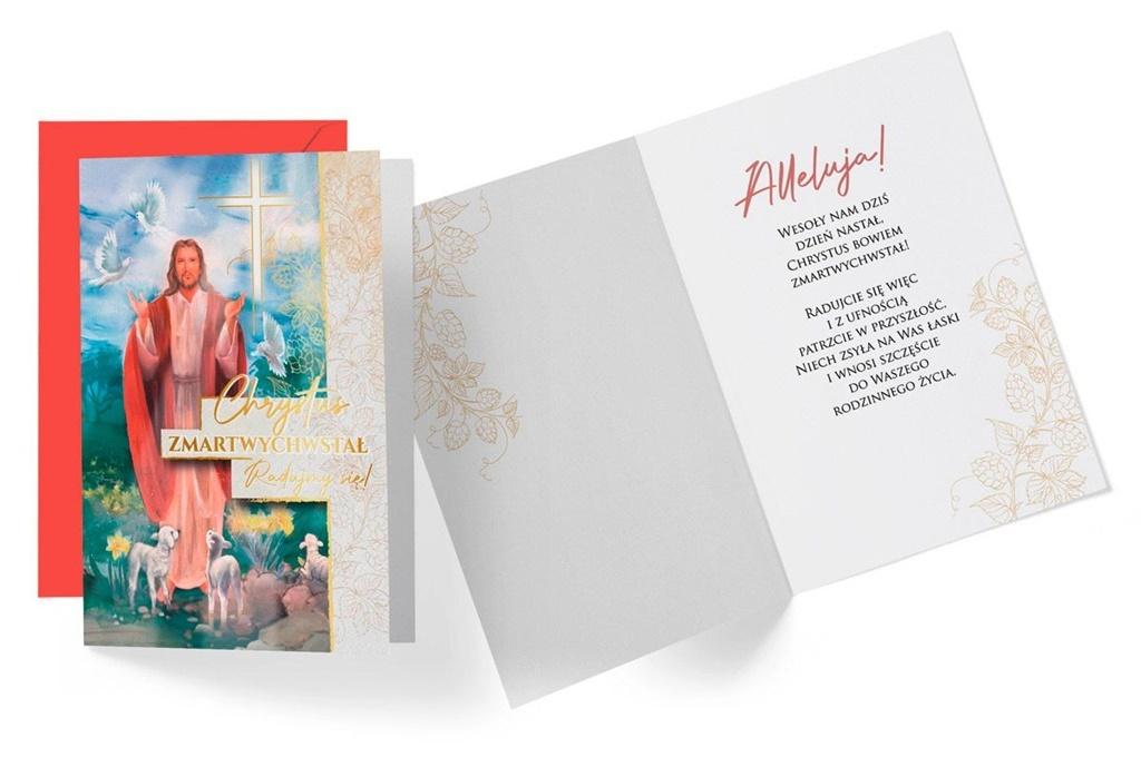 Karnet wielkanocny, posiada delikatne złote zdobienia. Kartka posiada tekst w środku, dołączona jest do niej koperta.