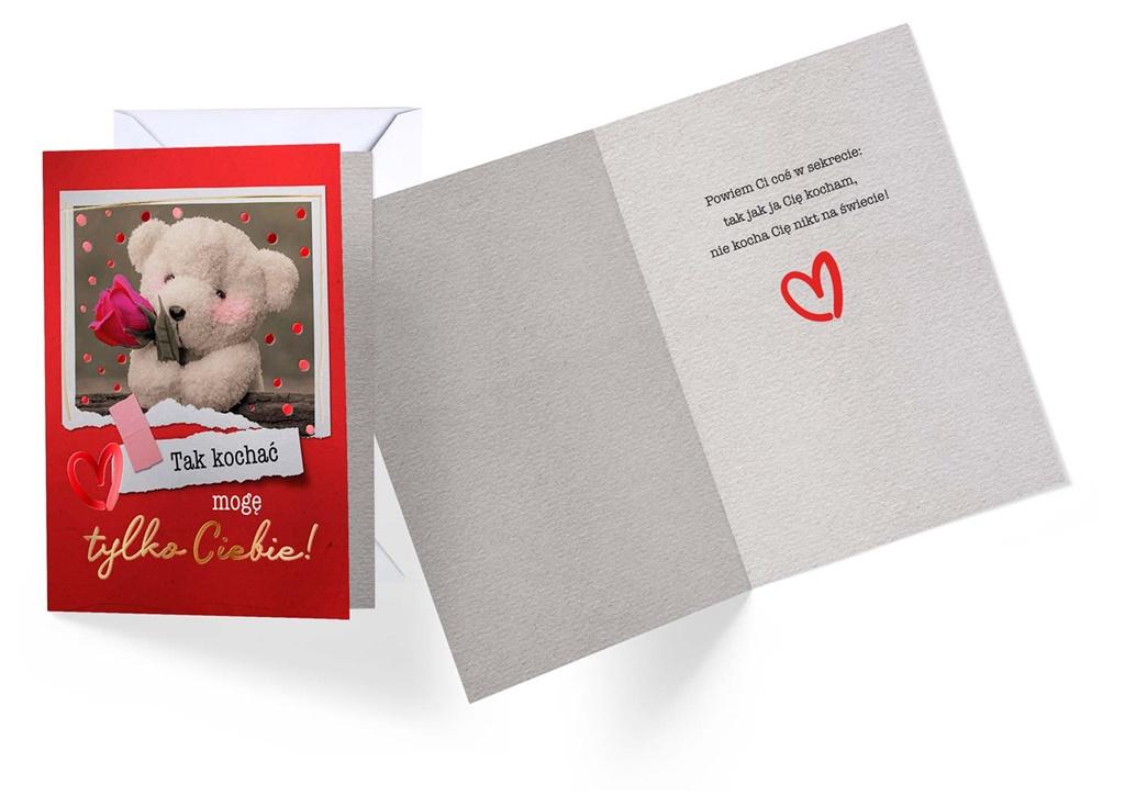 Kartka PR jest zdobiona przynajmniej dwoma rodzajami uszlachetnień - metaliczne lub perłowe folie, brokat, tłoczenie itp.- tyle piękna w takim drobiazgu! Każda kartka Passion Premium ma kolorowe wnętrze z tekstem wyjątkowych życzeń i grafiką, w komplecie jest także dopasowana kolorystycznie koperta. Cechy szczególne: wielkość: B6, 16.6 x 11.7 cm po złożeniu, koperta: dopasowana w zestawie, zdobienia: przynajmniej dwa rodzaje, często więcej - złota, srebrna lub perłowa folia, brokat, tłoczenia, wnętrze kartki: kolorowe, z życzeniami, okazja: Walentynki