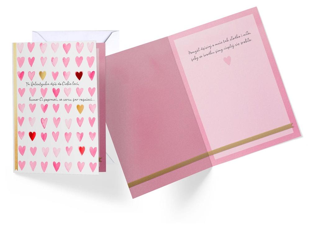 Kartka PR jest zdobiona przynajmniej dwoma rodzajami uszlachetnień - metaliczne lub perłowe folie, brokat, tłoczenie itp.- tyle piękna w takim drobiazgu! Każda kartka Passion Premium ma kolorowe wnętrze z tekstem wyjątkowych życzeń i grafiką, w komplecie jest także dopasowana kolorystycznie koperta. Cechy szczególne: wielkość: B6, 16.6 x 11.7 cm po złożeniu, koperta: dopasowana w zestawie, zdobienia: przynajmniej dwa rodzaje, często więcej - złota, srebrna lub perłowa folia, brokat, tłoczenia, wnętrze kartki: kolorowe, z życzeniami, okazja: Walentynki