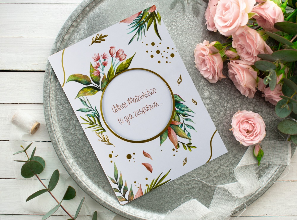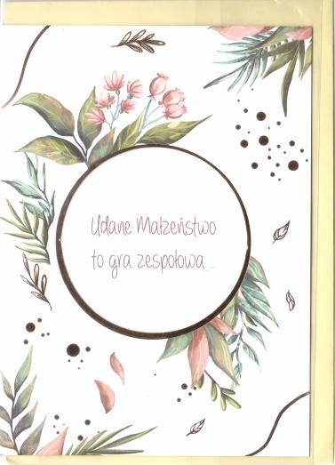 Karnet w formacie B6. Posiada wycięcie i wkładkę z życzeniami. Karnet złocony w zestawie z kopertą.