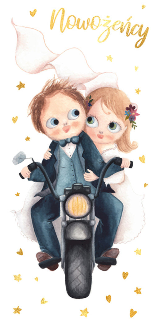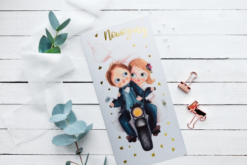 Karnet w formacie DL. Karnet złocony w zestawie z kopertą.