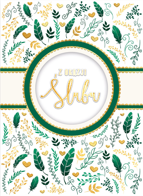 Karnet z kieszonką na pieniądze w formacie B6, składany z trzech. Złocony i tłoczony, teksy życzeń w środku. Wydrukowany na wysokiej jakości papierze. W zestawie koperta.