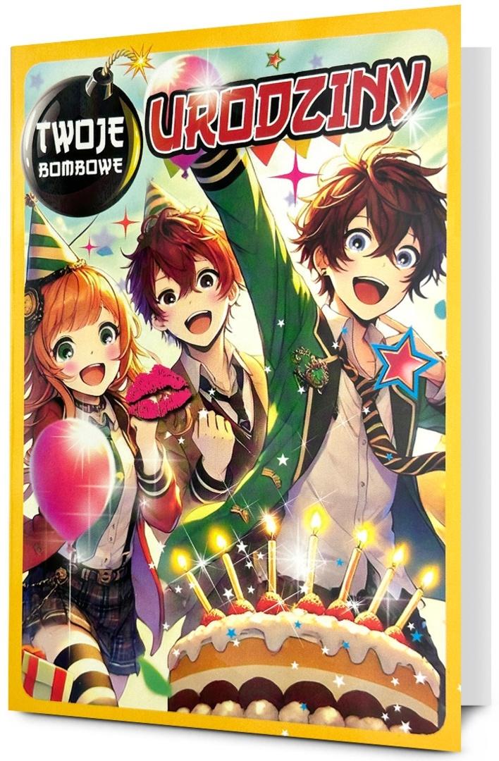 Kartka jest zdobiona opalizującą folią holograficzną, zawiera życzenia i kolorowy środek. W zestawie znajduje się koperta, kolorystycznie uzupełniająca się z kartką.