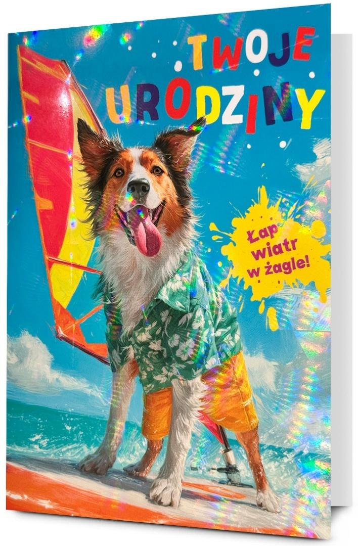 Kartka jest zdobiona opalizującą folią holograficzną, zawiera życzenia oraz kolorowy środek. W zestawie znajduje się koperta, kolorystycznie uzupełniająca się z kartką. Format złożonej kartki: B6