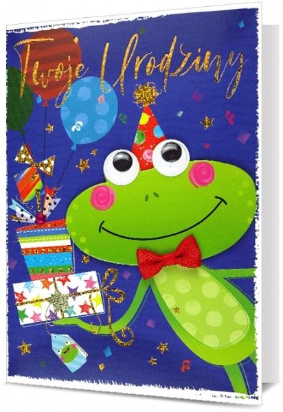 Wesoły i kolorowy urodzinowy karnet dziecięcy.