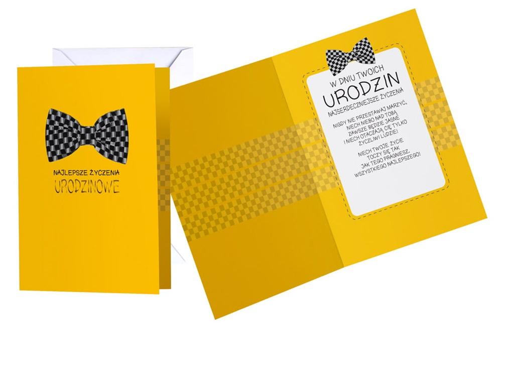 Kartka wielkości B6, zdobiona w zależności od wzoru metaliczną folią lub brokatem, kartka z tekstem w środku, kolorowa w środku i na zewnątrz.