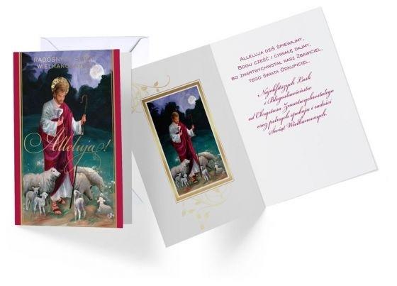 Karnet Wielkanoc Kartka wielkości B6. Karnet wielkanocny, posiada delikatne złote zdobienia. Kartka posiada tekst w środku, dołączona jest do niej koperta.
