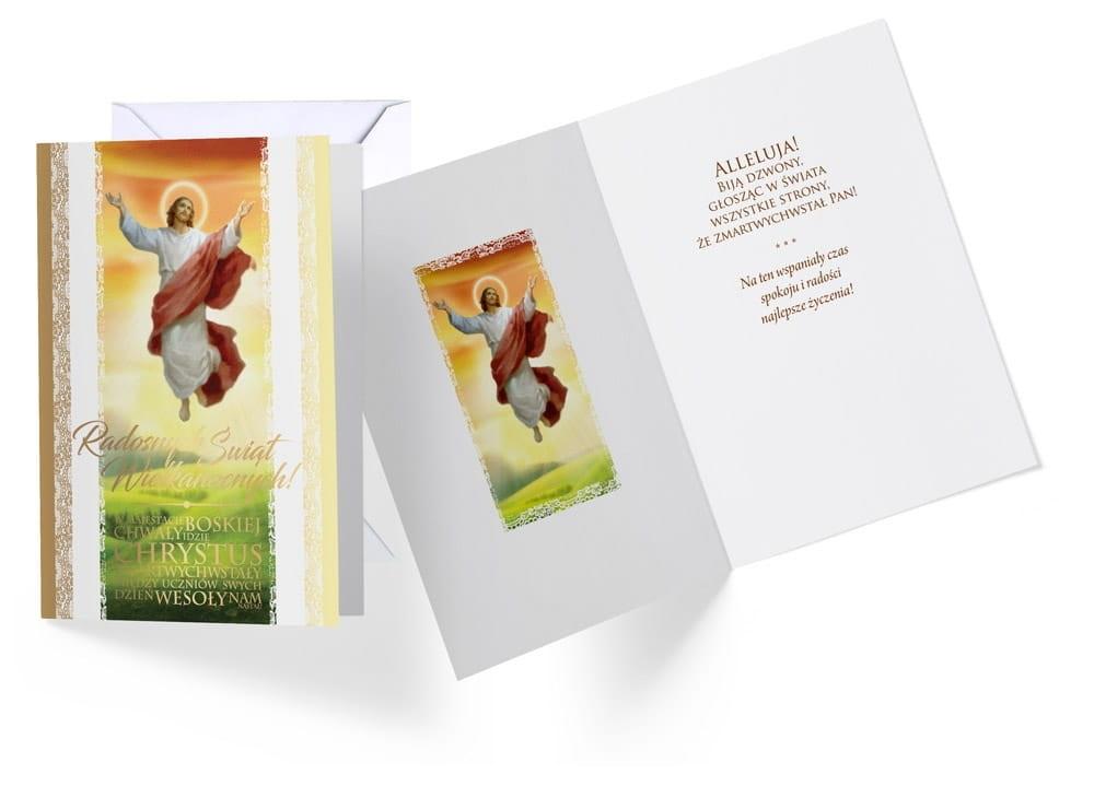 Karnet Wielkanoc Kartka wielkości B6. Karnet wielkanocny, posiada delikatne złote zdobienia. Kartka posiada tekst w środku, dołączona jest do niej koperta.