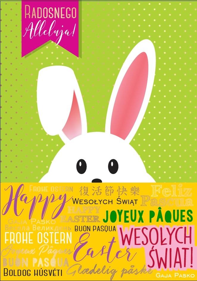 Karnet Wielkanoc Kartka wielkości B6. Karnet wielkanocny, posiada delikatne złote zdobienia. Kartka posiada tekst w środku, dołączona jest do niej koperta.