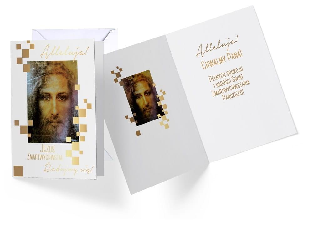 Karnet Wielkanoc Kartka wielkości B6. Karnet wielkanocny, posiada delikatne złote zdobienia. Kartka posiada tekst w środku, dołączona jest do niej koperta.