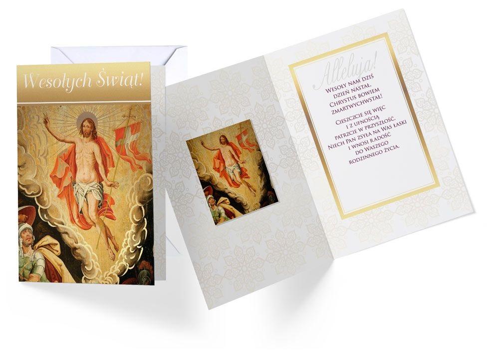 Karnet Wielkanoc Kartka wielkości B6. Karnet wielkanocny, posiada delikatne złote zdobienia. Kartka posiada tekst w środku, dołączona jest do niej koperta.