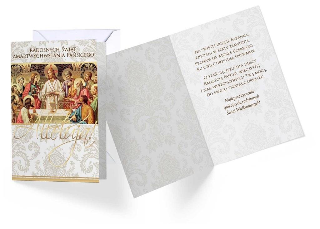 Karnet Wielkanoc Kartka wielkości B6. Karnet wielkanocny, posiada delikatne złote zdobienia. Kartka posiada tekst w środku, dołączona jest do niej koperta.