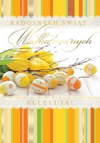 Karnet Wielkanoc Kartka wielkości B6. Karnet wielkanocny, posiada delikatne złote zdobienia. Kartka posiada tekst w środku, dołączona jest do niej koperta.