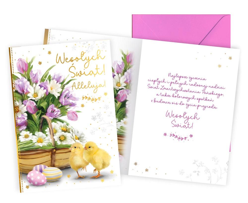 Kartka wielkości B6, zdobiona w zależności od wzoru metaliczną folią lub brokatem. Każda kartka posiada kolorowe życzenia w środku i dopasowaną kopertę w komplecie.