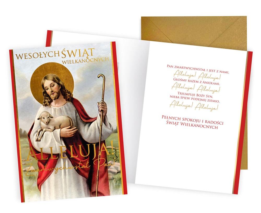 Kartka wielkości B6, zdobiona w zależności od wzoru metaliczną folią lub brokatem. Każda kartka posiada kolorowe życzenia w środku i dopasowaną kopertę w komplecie.