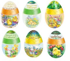Karnet B6 (11,5x16,0 cm) brokatowany, wycięty w kształt jajka, wolnostojący (po złożeniu możliwość postawienia karnetu w pionie) z kolorowym rewersem i życzeniami. Pakowany do folii wraz z kopertą w miksie seriami po 25szt.