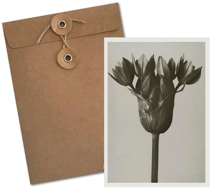 Wyjątkowy karnet retro (bez tekstu) z serii Karl Blossfeldt. W zestawie oryginalna brązowa koperta wiązana na sznurek.