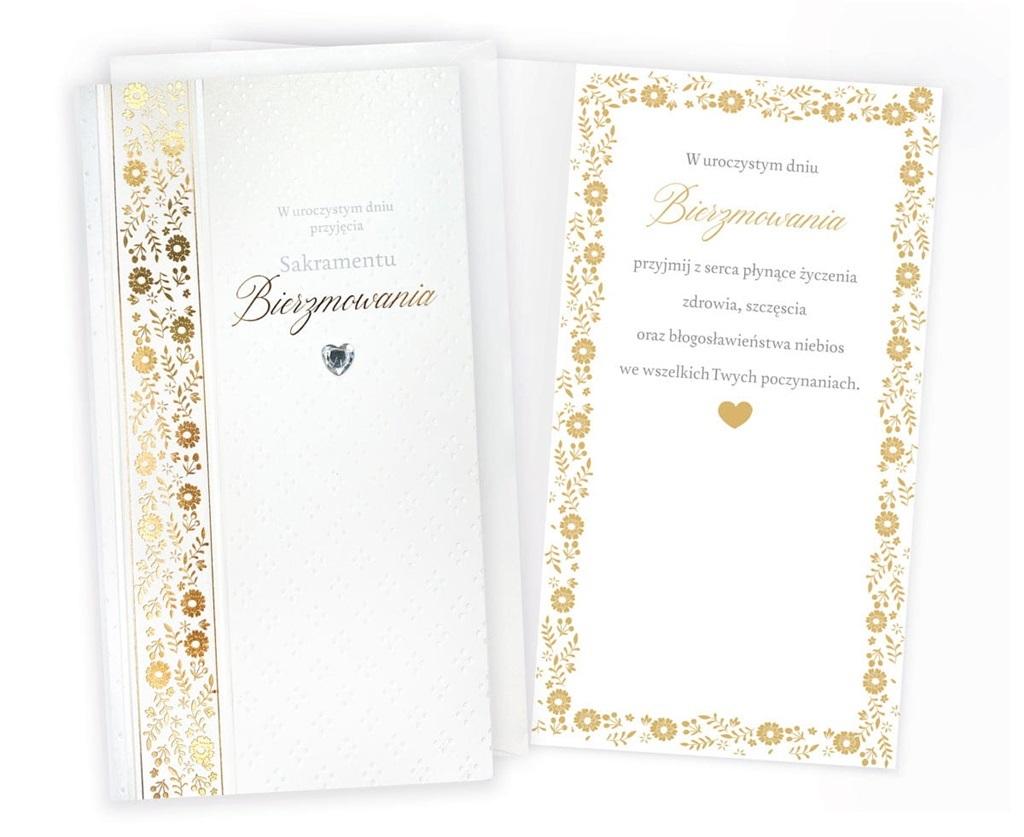 Każda kartka w kolekcji Passion Moments to małe arcydzieło - wyjątkowe i niepowtarzalne, piękne wizualnie. Kartki PM są bardzo bogato zdobione, a jednocześnie skromne i stylowe, cały efekt tkwi w detalach i doskonałym wykonaniu. W zależności od wzoru, na kartkach znajdują się dekoracje ze złotej, srebrnej, perłowej lub holograficznej folii, a także doklejki biżuteryjne, kokardki, brokat, laserowe wycięcia, wstążeczki i inne dodatki. Wnętrze karnetu to zawsze atrakcyjna grafika i tekst życzeń. Kartki mają w komplecie dopasowaną kopertę. Cechy szczególne: zdobienie: przynajmniej dwie folie (metaliczne/perłowe/holograficzne), brokat, elementy doklejane, wycięcia laserowe, wstążeczki - w zależności od wzoru, wnętrze: z delikatną grafiką, wyjątkowe życzenia w środku, w komplecie: dopasowana kolorystycznie koperta, okazja: bierzmowanie Wymiary karnetu po złożeniu: 11,4 x 21,5 cm.