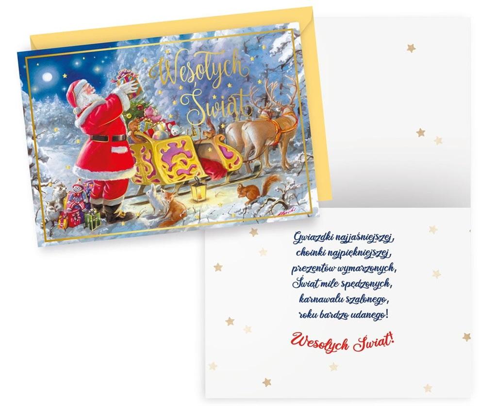 Kartka wielkości B6, zdobiona w zależności od wzoru metaliczną folią lub brokatem. Każda kartka posiada kolorowe życzenia w środku i dopasowaną kopertę w komplecie. Wymiary karnetu po złożeniu: 11,7 x 16,6 cm.