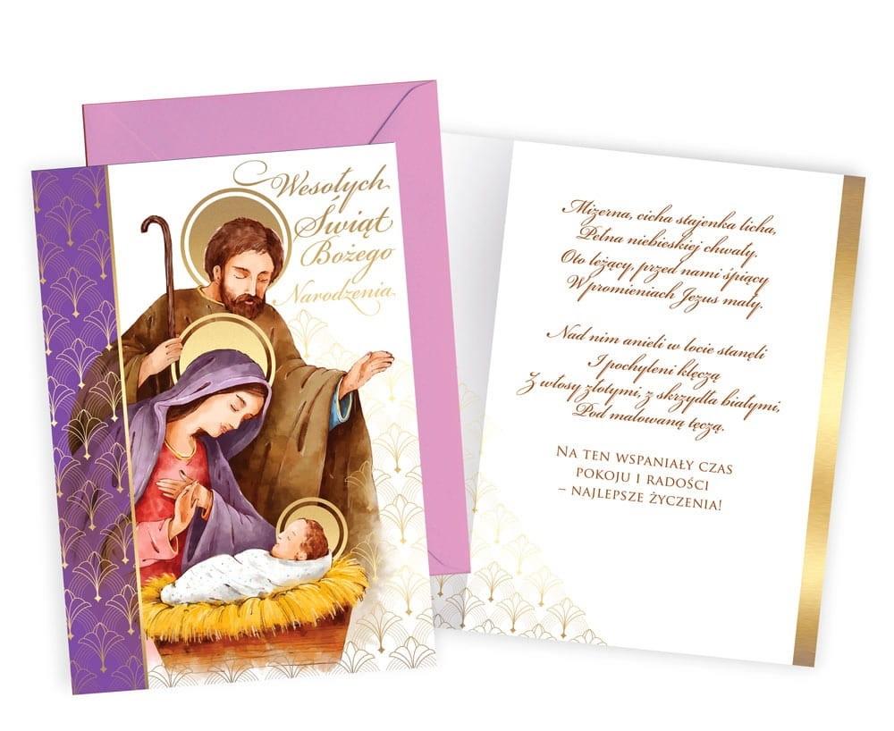 Kartka wielkości B6, zdobiona w zależności od wzoru metaliczną folią lub brokatem. Każda kartka posiada kolorowe życzenia w środku i dopasowaną kopertę w komplecie. Wymiary karnetu po złożeniu: 11,7 x 16,6 cm.