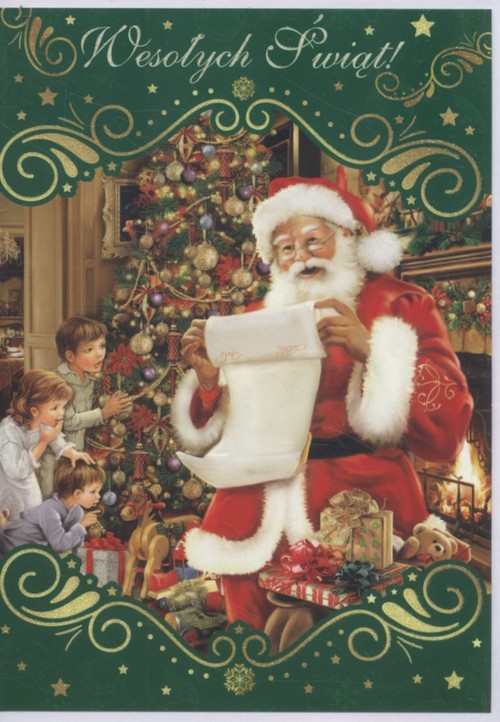 Składany karnet z miejscem na wpisanie życzeń z okazji Bożego Narodzenia i Nowego Roku Format złożony: 119x168 mm, rozłożony 238x168 mm Karnet foliowany i brokatowany, w komplecie koperta