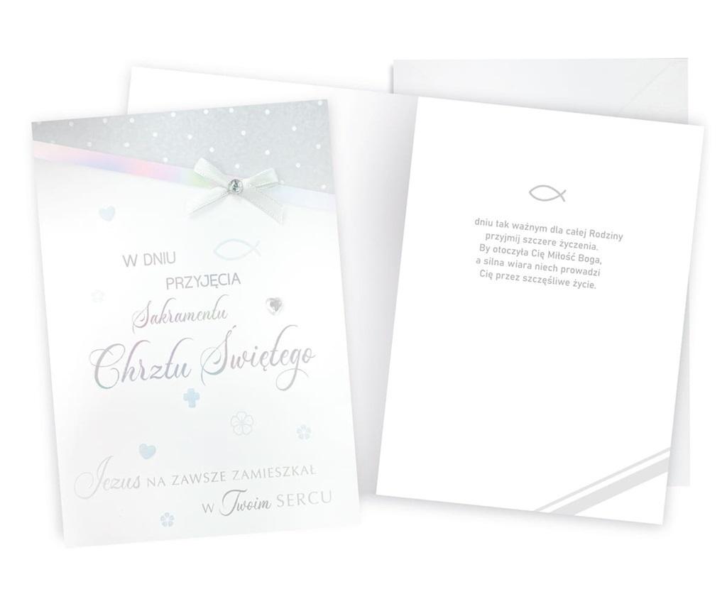 Karnet Dream Cards Plus "Chrzest" w powiększonym tzw. Angielskim formacie 140x190 mm. Kartka z ozdobnej serii Dream Cards Plus robi wrażenie dzięki atrakcyjnej kolorystyce i ciekawym zdobieniom. To idealny wybór łączący przyjazną cenę z jakością. Cechy szczególne: wielkość: 145 x 195 cm po złożeniu kopertą, wnętrze: kolorowe, wyjątkowe życzenia w środku, w komplecie: dopasowana kolorystycznie koperta. zdobienia: różnorodne, bogate (w zależności od wzoru: przyklejane dekoracje, elementy biżuteryjne, odstawniki, brokat, metaliczne folie, tłoczenia itp.), okazja: chrzest