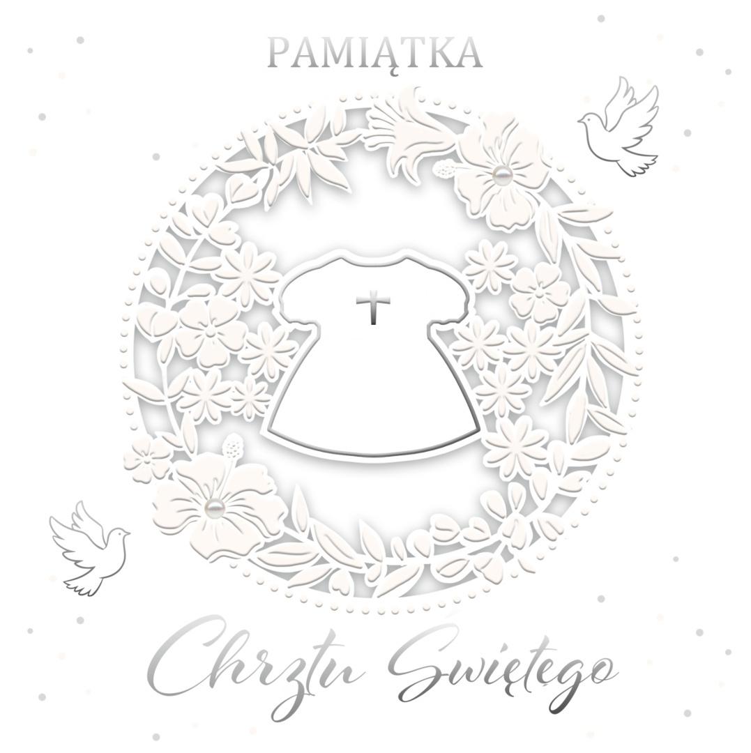 Elegancki karnet Chrzest Św. w formacie kwadrat 17 cm na 17 cm z laserowo wycinanym wzorem. Delikatny, ażurowy motyw z symbolami. Wewnątrz miejsce na życzenia. Idealna pamiątka tego ważnego dnia.