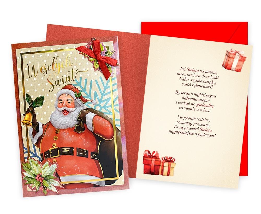 Kartka Dream Cards DK-1189. Kartka B6 z ozdobnej serii Dream Cards na Boże Narodzenie - nieduża, ale robi wrażenie dzięki atrakcyjnej kolorystyce i ciekawym zdobieniom. To idealny wybór łączący przyjazną cenę z jakością. Cechy szczególne: wielkość: B6, 16.6 x 11.7 cm po złożeniu, koperta: w zestawie, kolorowa, zdobienia: różnorodne, bogate (w zależności od wzoru: przyklejane dekoracje, elementy biżuteryjne, odstawniki, brokat metaliczne folie, tłoczenia itp.), okazja: Boże Narodzenie.