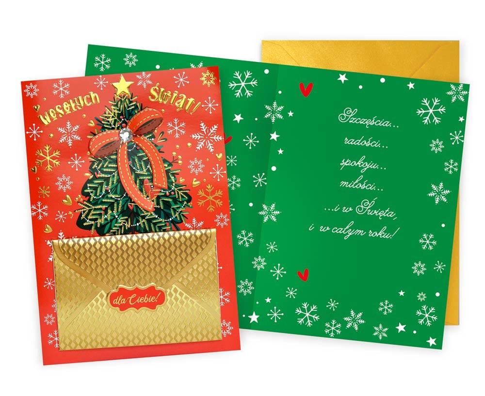 Kartka Dream Cards DK-1207. Kartka B6 z ozdobnej serii Dream Cards na Boże Narodzenie - nieduża, ale robi wrażenie dzięki atrakcyjnej kolorystyce i ciekawym zdobieniom. To idealny wybór łączący przyjazną cenę z jakością. Cechy szczególne: wielkość: B6, 16.6 x 11.7 cm po złożeniu, koperta: w zestawie, kolorowa, zdobienia: różnorodne, bogate (w zależności od wzoru: przyklejane dekoracje, elementy biżuteryjne, odstawniki, brokat metaliczne folie, tłoczenia itp.), okazja: Boże Narodzenie.