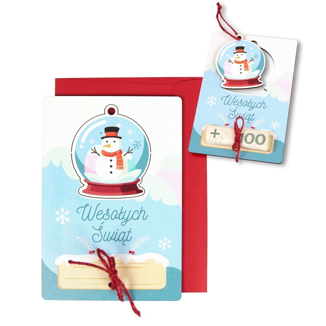 Drewniana kartka z kolorowym nadrukiem na Święta Bożego Narodzenia. Ciekawa alternatywa dla klasycznej kartki. Karnet zawiera dwa otwory wraz ze sznurkiem do przewiązania banknotu jako prezentu dla obdarowanej osoby. Dodatkowo jest laserowo wycięta bombka/zawieszka, którą wystarczy delikatnie wyłamać z kartki i może posłużyć jako dekoracja choinki.