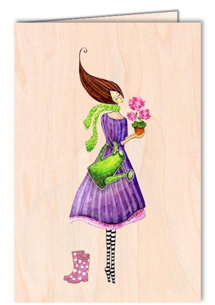 Karnet drewniany C6 + koperta Kobieta z konewką