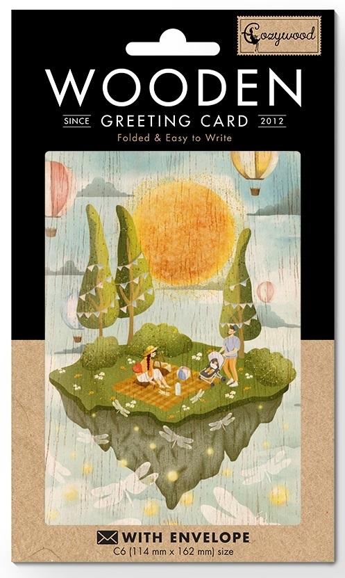 Drewniany karnet w formacie C6 z kopertą. W środku nie zawiera tekstu. Ten karnet jest w 100% biodegradowalny, wykonany przy użyciu minimalnego nakładu energii, gazu i wody. Jego wytworzenie zużywa 5 razy mniej drewna niż wykonanie karnetu papierowego. Wyprodukowany na Litwie.