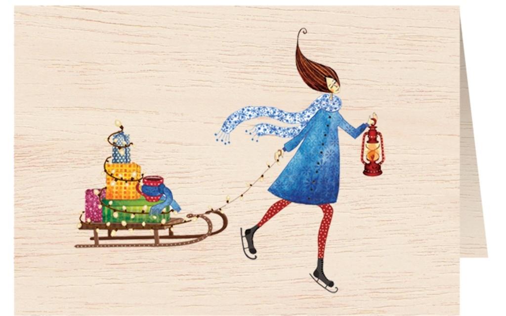 Opakowanie Karnet drewniany C6 + koperta Święta Kobieta z sankami