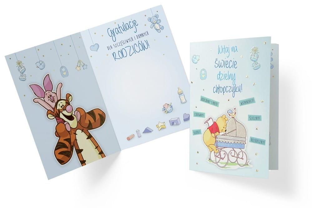Witaj na świecie dzielny chłopczyku! Kartka z okazji narodzin z serii Disney jest kolorowa z każdej strony i zdobiona na froncie. W środku są krótkie życzenia i miejsce na własną dedykację.