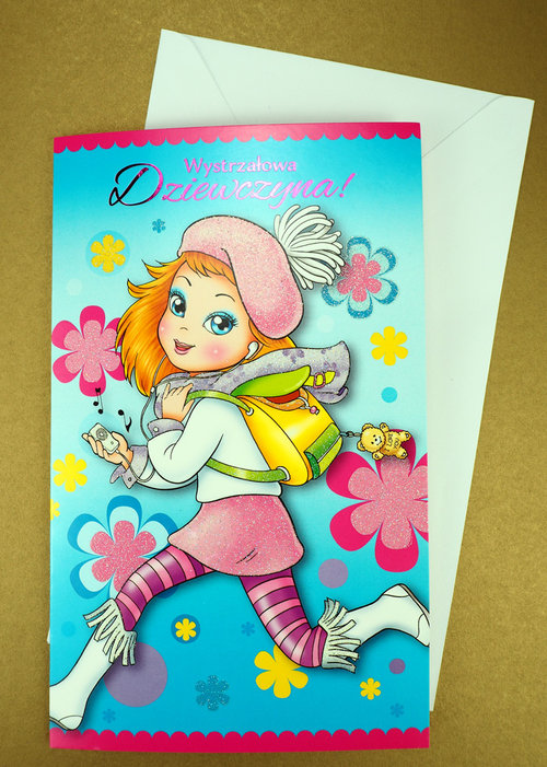 Barwny karnet z życzeniami i kopertą. Zdobiony dziewczęcym motywem z dodatkiem błyszczącego brokatu. Wewnątrz karnetu kolorowy środek i życzenia. "Idzie misio, idzie konik, małpka, piesek no i słonik. Wszyscy razem z balonami, z najlepszymi życzeniami. Bo to dzień radosny wielce - masz znów jeden roczek więcej!" Format: 11,5x19 cm